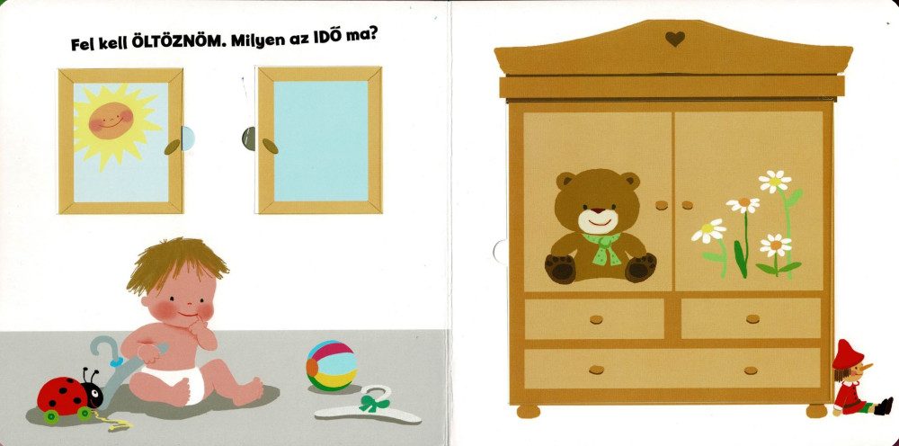Mennyi felfedezni való vár kisbabánkra! Nézzétek meg együtt ezt a különleges lapozót! Nyissátok ki a kis ablakokat, vajon mi van a fülek mögött? Ott egy kutyus, egy mókus vagy egy babaruha.
